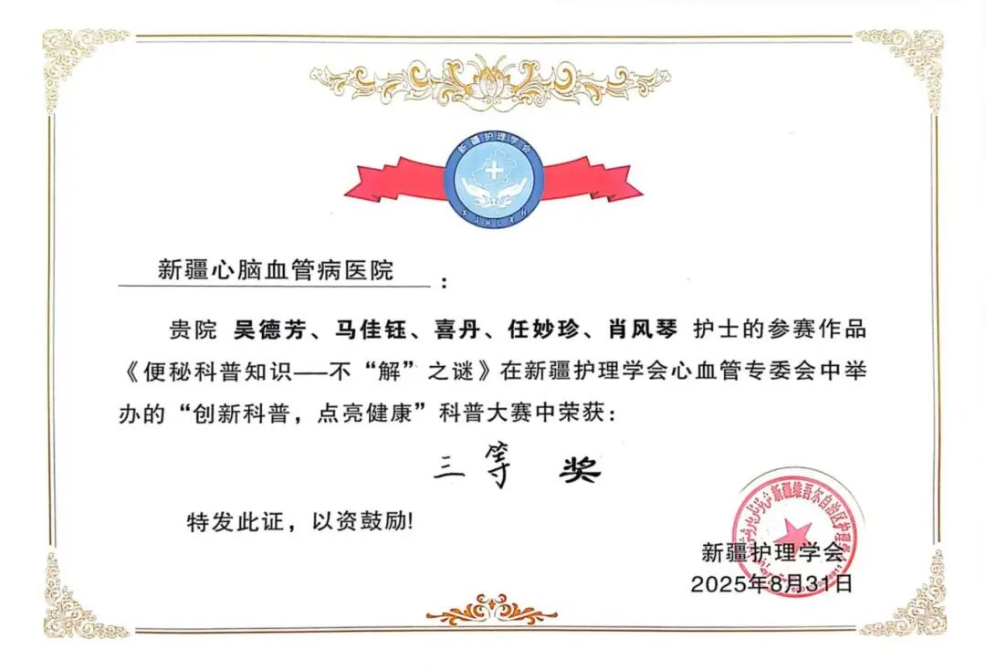 此次获奖,不仅是对医院护理团队科普创作能力与专业素养的肯定,更体现了医院在护理科普人才培养、作品创作及成果转化方面的扎实成效。未来,新疆心脑血管病医院及护理部将以此为契机,持续加强科普人才梯队建设,深耕医学科普内容创作,打造更多兼具科学性、通俗性与趣味性的优质科普作品,助力科普知识广泛传播,为提升公众健康素养贡献更多力量。