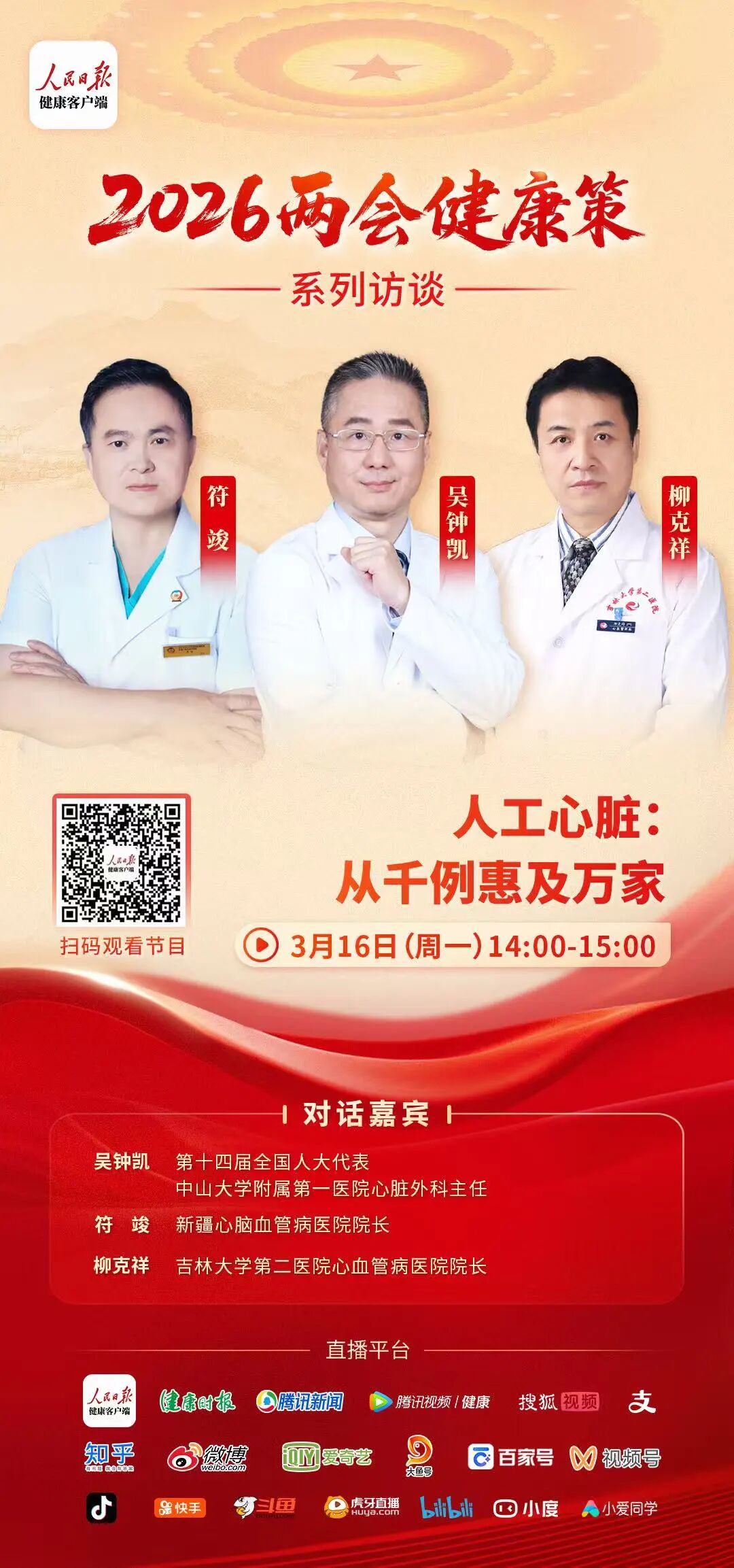 新疆心脑血管病医院院长符竣教授受邀做客 “两会健康策” 直播间,与第十四届全国人大代表、中山大学附属第一医院心脏外科主任吴钟凯,吉林大学第二医院心血管病医院院长柳克祥齐聚一堂,共同探索 科技创新如何赋能“人工心脏” ,为终末期心衰治疗的高质量发展描绘出一幅生动的蓝图。